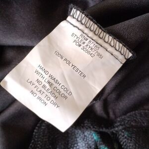 Bold black and teal paisley satiny fabric. Gathered at chest, built in bra. Ruched and folded waistband. Ties in the back. Adjustable straps. Full skirt. Back zip. Fully lined trimmed with a net ruffle that shows below the dress. So pretty for an evening out. Lovely.