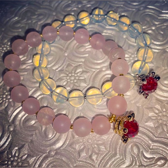 This set includes two beaded bracelets with gold and silver accents and charms.