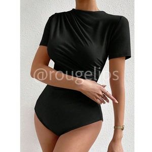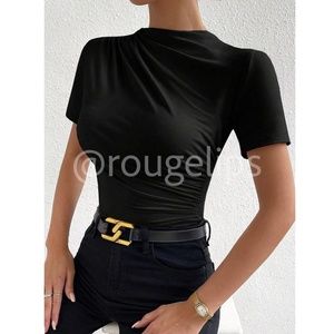 Ruched Black Asymmetrical Short Sleeve Bodysuit