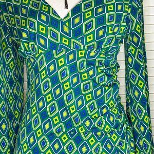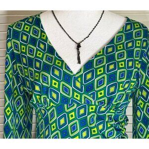 Ruched Geo Print Womens Stretch Babydoll Midi Dress Sz S Split Sleeve 70s