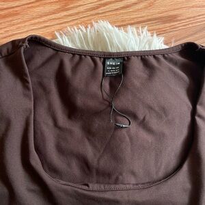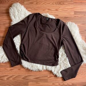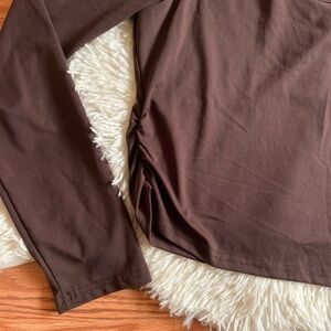 New without tags, size Large. Sides of shirt are ruched, dark brown color. Material: 94% polyester, 6% elastane Armpit to armpit 17”