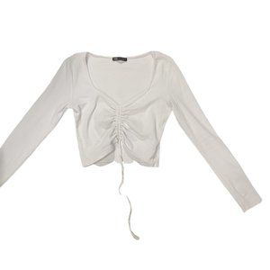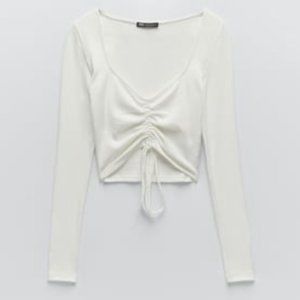 Ruched Ribbed Front Tie Long Sleeve Top