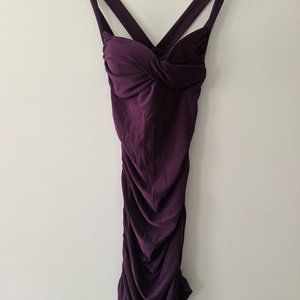 AKIRA royal purple bodycon midi/mini dress. Full ruched stretch on both sides of the dress. It is long when stretched can reach above or below knees depending on height.
