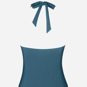 Have some fun in the sun in this one-piece swimsuit featuring a halter neckline, twisted bodice, ruching, and a back self-tie closure.