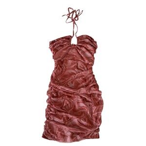 Ruched Velvet Swirl Halter Mini Pink Dress Small
