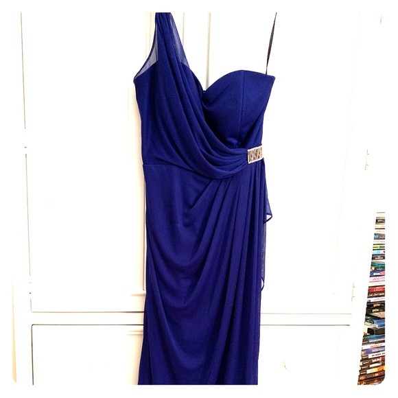 Awesome and sexy off the shoulder gown with ruched waist and full lining. Flows nicely across the body and can be used for formal or semi formal affair. Great navy color. 13” inch across the bust and 48” from under arm to hem. Bra lined, chiffon polyester material.