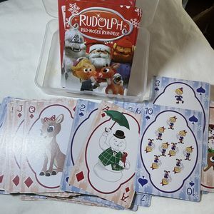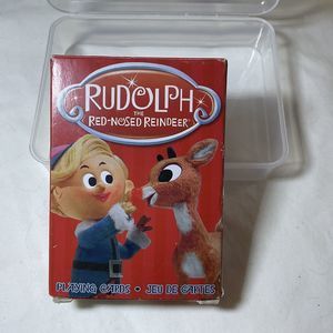 Clear Plastic box with Santa is coming Tonight decal on top. Box contains a used deck of Rudolph the Red Nosed Reindeer Cards. Deck includes 52 cards plus 2 jokers