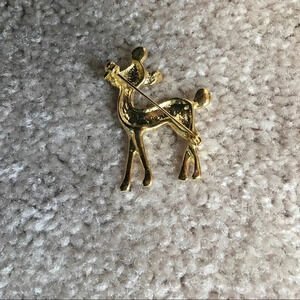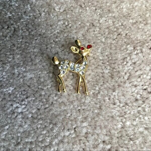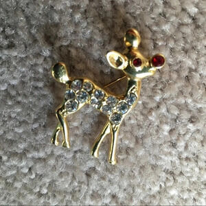 Rudolph The Red Nosed Reindeer Brooch Pin. The reindeer has some rhinestones on it. The pin is 1” Long. 1 1/2” Tall. In used condition. No Modeling or trades.