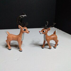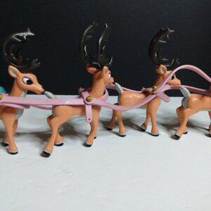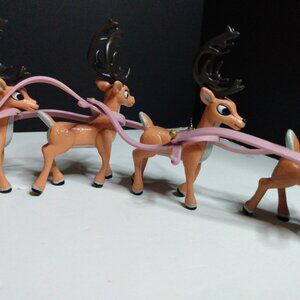 Rudolph The Red Nosed Reindeer Santa's Sleigh & Reindeer Team Figurine Set By Memory Lane. Used, not new. Is missing Santa and his bag, some of the sleigh reign attachments, and the piece that attaches to the stand to make it 'fly'. Items seen in pictures is what comes with it. Includes Rudolph, six reindeer, sleigh, harness, and ice block stand. Figures do not stand well. 2004.