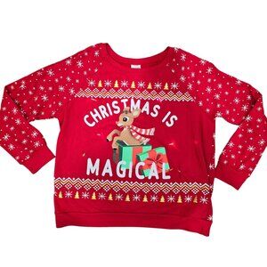 This Rudolph The Red-Nosed Reindeer Christmas sweater brings festive cheer with its "Christmas Is Magical" message, featuring a playful reindeer and vibrant gift graphic. The sweater lights up, adding a touch of sparkle to your holiday celebrations. Crafted from a soft cotton and polyester blend, it ensures comfortable wear throughout the season.
