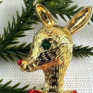 This festive brooch adds a playful touch to any outfit. Featuring Rudolph with a shiny red nose, green rhinestone eye, and a bold red bow tie.