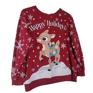 Rudolph holiday sweatshirt with snowflakes and “Happy Holidays” graphic. No size tag but fits like a Large to XL based on measurements. Soft, cozy, and in great condition.