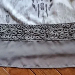 Front is gray, white and darker gray with a lacy gray band around the bottom ending with a sheer gray panel.