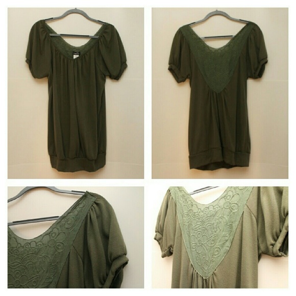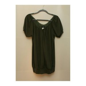 Army green. Loose fit fabric. Front v cut. Slightly low back. Can be worn hanging off the shoulders, on the shoulders or anything between because of the wide neck. Tags still on.