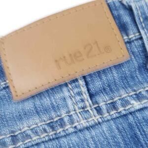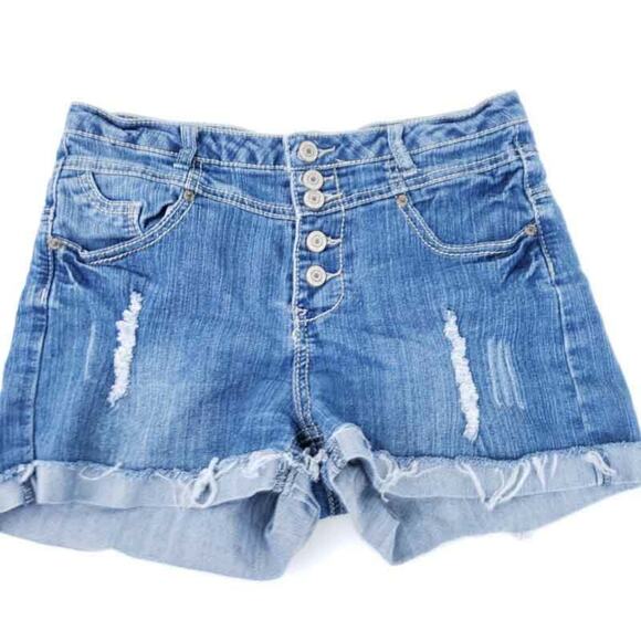 Rue 21 Blue Jean Denim Shorts Distressed Size 7/8, Cut Off Button Fly, Festival. Cotton, polyester, spandex.