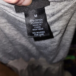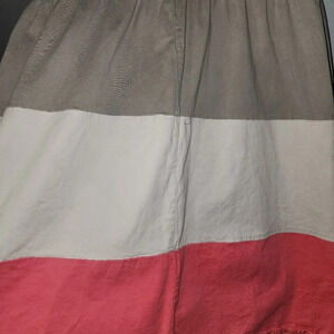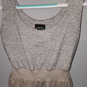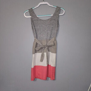 This is a dress in good used condition by Rue 21. Its primary color is grey and the skirt features stripes in a coral color, grey and white. There is a back tie as well to customize fit.