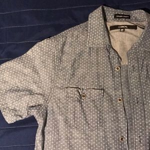 Good Condition. Short Sleeved. Lighter Bluish-Grey With White Print