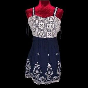 EUC Juniors Rue 21 navy mini sundress with white lace and embroidered flaroal details.