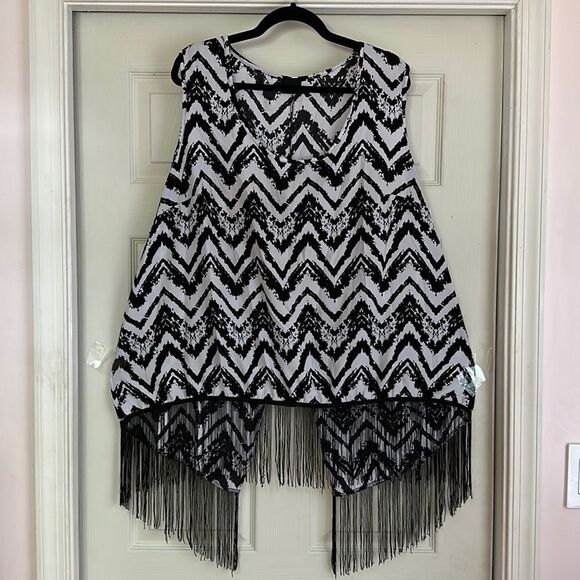 Rue 21 Plus Woman’s Sleeveless Top Silky Black & White Zigzag Stripes Fringe 2X 3X