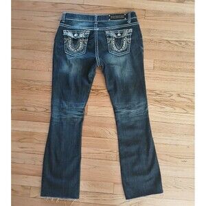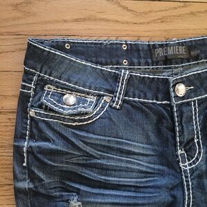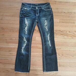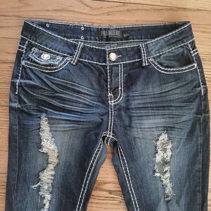 Rue 21 Premiere Ripped Denim Jeans Rhinestone Bling Flap Pockets Dark Wash