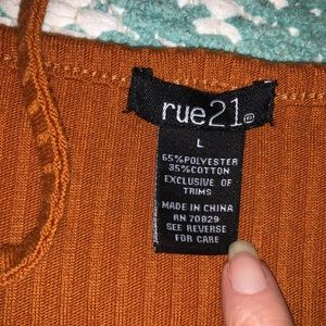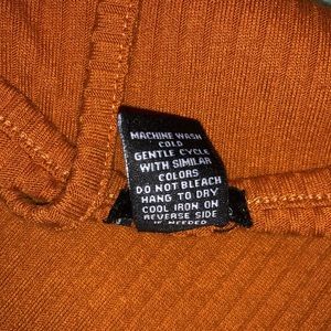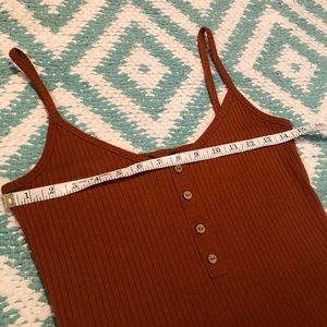 Ribbed tank top with cute button detail in front,burnt Orange in color, spaghetti straps, measurements in photos.
