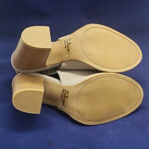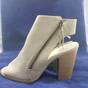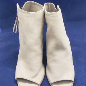 Cute Ivory heels size 10. They have an open toe cutout and a zipper on the outside. In good Condition. See All Photos. See my other listings and follow for more.