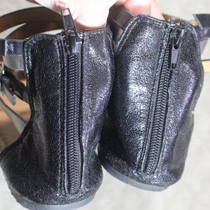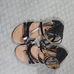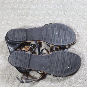Cute black strappy sandals with one silver strap. Zips up the back and wraps around the ankle. Excellent pre-owned condition - no flaws, minimal signs of wear - see soles.