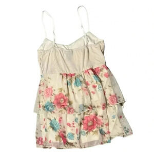 Rue 21 Floral Summer Top This elegant and airy top is perfect for summer outings beige with delicate ruching, creating texture and visual interest. The flowy skirt features vibrant floral prints of roses in bloom on a beige background. Thin spaghetti straps offer a comfortable fit. Summer, Floral, Roses, Beige, Flowy, Elegant, Comfortable. Measurements Pit to Pit:13” Length:18”