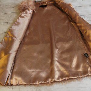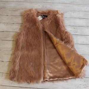 This faux fur vest is beautiful. It is a vintage shade of off pink shaggy fur. The front has two large front hook and eye closures and there are side pockets. It is labeled S/M and fits women's size small to medium. It is new with tags.
