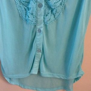 Blue sleeveless button up. Lace design on front. Size Medium. Lightly loved.