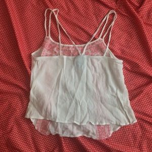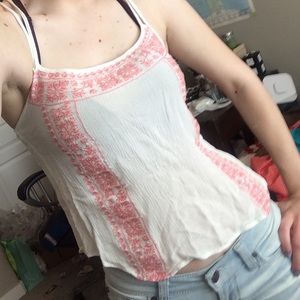 Rue 21 white and pink embroidered strappy tank top. I wore this a few times but decided the length was odd on me. I'm 5'6 and it is too long to be a crop on me. The fabric is very light and airy, making it great for the hot weather. It has straps like a regular top and then two going to a point like a racerback. The purple straps in the pictures are from my bra.
