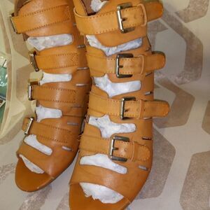 Rue 21 etc! Tan leather strap up wedges, size 7/8M