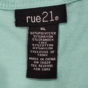 Stylish Rue 21 women's short sleeve top in a vibrant teal hue. Features a delicate lace bottom and a convenient front pocket. In size XL for a comfortable fit. Perfect for casual wear!