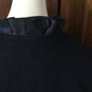 Rue 21 black wool/polyester/nylon blend jacket. Tons of style details with stand up satin pleated collar that moves down both front edges and around hemline. Upper and lower front button flap pockets. Bottom pockets also have pleated ruffle accent on front. Tie fabric belt. Vertical topstitched seams front and back. Black/red/ ivory patterned silky lining. Size small. Excellent condition. Nonsmoking home.