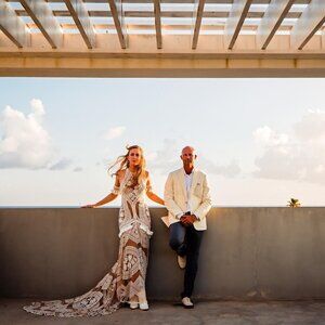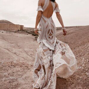 Nude and white East gown with tassel armbands. Originally purchased for $3633 from Lovely Bride. Worn once and professionally dry cleaned after and has been stored in preservation plastic and garmet bag. Size UK 12 with minimal alterations done and still full length. I am 5'11 160lbs and wear a dress size 6 and jeans size 28. There are removable bra cups size B tacked in.