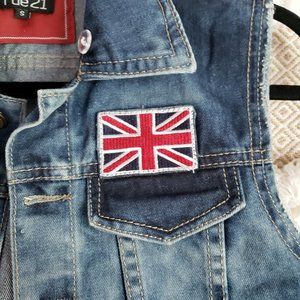 This vest features an American flag above the left faux front pocket and a British flag above the right faux pocket. Factory distressed. Gently used but in great condition. Please see photos for details.