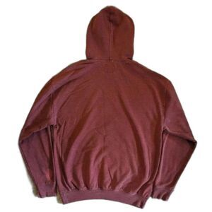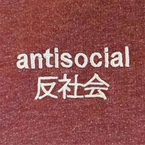 Rue21 maroon hoodie, antisocial graphic with Chinese characters, size small. Discoloration on the left sleeve and front pocket shown in photos