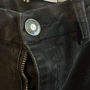Stylish black flare jeans with edgy distressed details. Perfect for a trendy look.