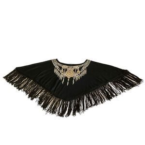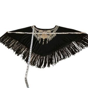 Blouse Cape Poncho Style by Rue21 in black with tan dream catcher feather print Trimmed in Fringe Women Size XS