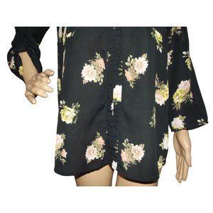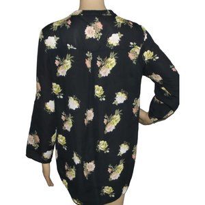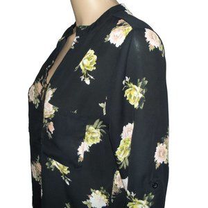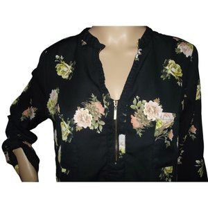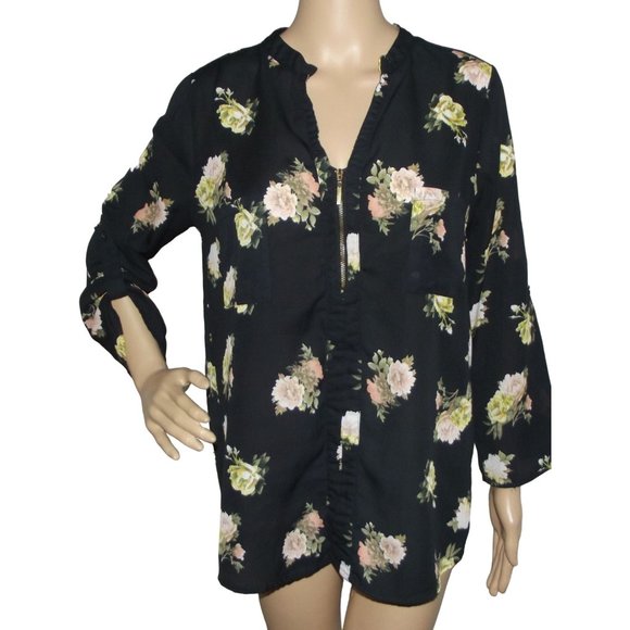 Rue21 Blouse Sz Medium black floral tunic zipper v-neck Pockets roll tab sleeve