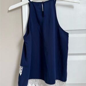 This sleeveless tank top from Rue21 features a striking blue body with an asymmetrical design, highlighted by an embellished white lace trim.