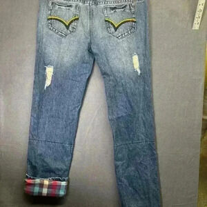 Trendy blue jeans with stylish distressing. Straight leg fit. Ideal for casual wear.