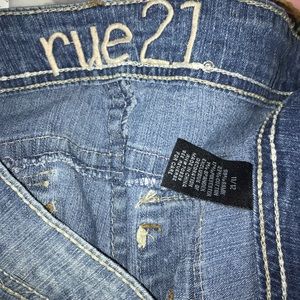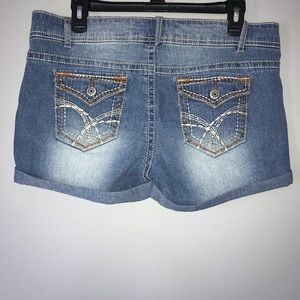 Stylish blue jean shorts. Features tan stitching on pockets. Perfect for casual wear.