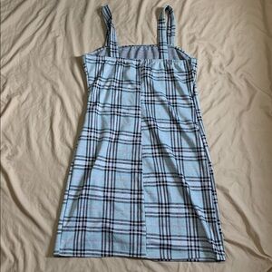 Chic blue plaid mini dress. Square neckline. Sleeveless design. Perfect for casual outings. Size tag has been cut out, but fits a size Large.