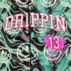 Bold jersey with teal and black swirl design. Features 'Drippin'' text and number 13. Eye-catching and fun.