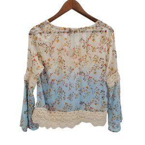 boho floral blouse, crochet hem top, sheer festival blouse, spring peasant top, ombré floral shirt, cream blue long sleeve blouse, cottagecore lace trim, romantic sheer blouse, Rue21 boho chic top, whimsical festival fashion