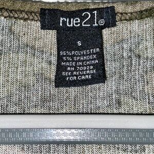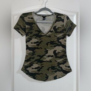 Trendy camo print with ribbed texture. Short sleeves and V-neck design. Ideal for casual wear.