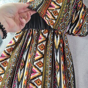 Fun and vibrant Rue21 juniors dress in size Medium with an Aztec-inspired multicolor print 🎨. Features cold shoulder cutout sleeves and a flattering elastic waistline for a breezy, boho-chic look 🌸. Perfect for summer, vacations, or festival wear 🌞🎶.