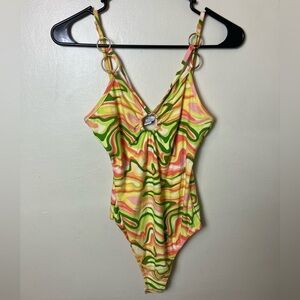 Vibrant swirl pattern. Features green, yellow, and pink. Stylish ring accents on straps. Perfect for a bold look.