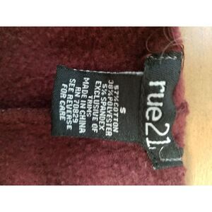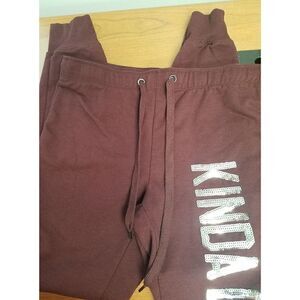 Rue 21 Small "Kinda Don't Care" sweatpants. Burgundy sweatpants with "KINDA DON'T CARE" in sequence down the left leg. Fold down, elastic waistband with drawstring.